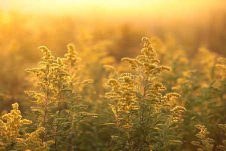 Goldenrod - Solidago blooming in a meadow during sunrise, Poland.