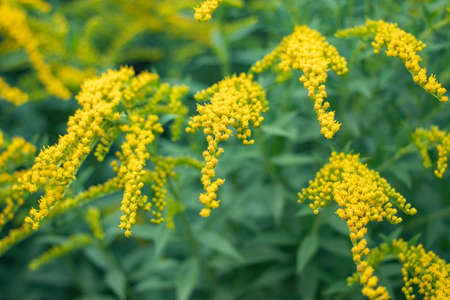 Yellow goldenrod flowers in summer park. Solidago plant.