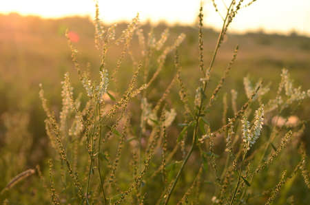 Flowering meadow grass in the rays of the setting sun