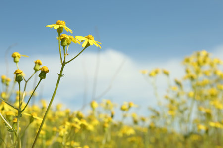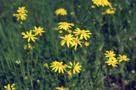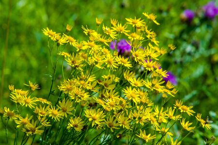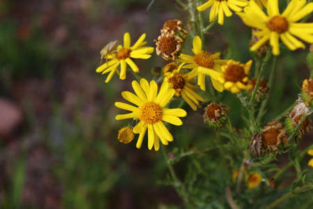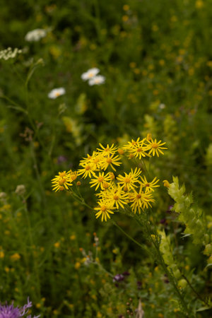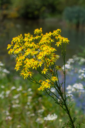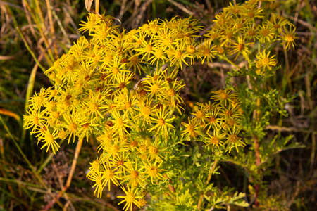 Jacobaea (Jacobaea vulgaris) is a poisonous herb that is dangerous to pets. Yellow wildflowers.