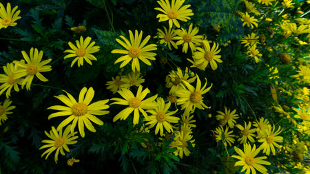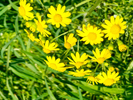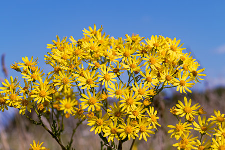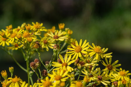 Clusters of bright yellow flowers of Jacobaea vulgaris bloom vibrantly in a lush green environment illustrating the vivid colors of Tansy ragwort in late summer.