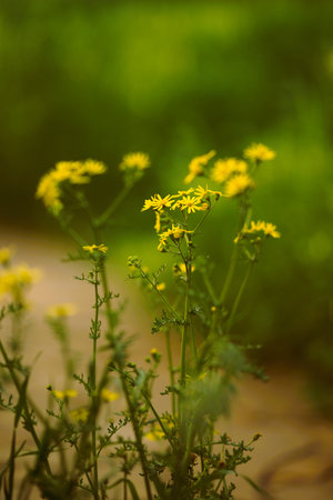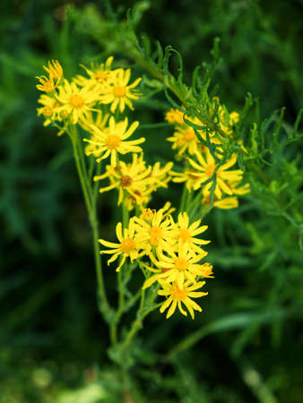 Wild plant Jacobaea vulgaris in the forest meadow. Known as ragwort, stinking Willie or tansy ragwort. Yellow delicate flower on a green background.