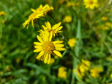 Yellow flowers on a green meadow. selective focus. Shallow depth of field