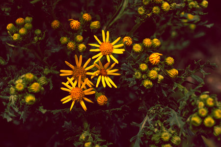 Vibrant Yellow Ragwort Blossoms in Moody Low Light Close-Up Against a Dark Forest Backdrop