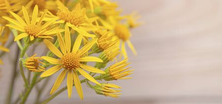Senecio squalidus Yellow flowers of Oxford ragwort, panoramic view, Jacobaea vulgaris. Floral header daisy family Asteraceae blooming copy space text meadow macro close up UK