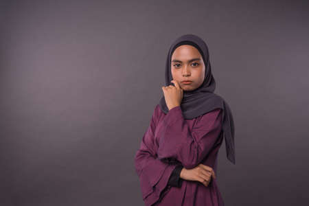 Portraiture of Muslim Girl wearing hijab.Serious face reaction.