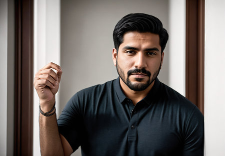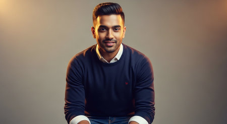 Handsome young Indian man in casual clothes posing in studio.