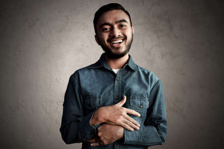 Charming young indian man in casual wear isolated on gray background
