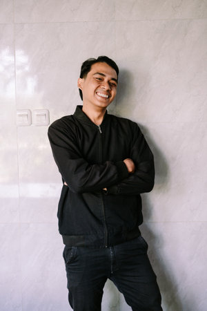 A confident young Asian man stands against a light gray tiled wall, looking to the side with a slight smile. He wears a stylish black bomber jacket with arms crossed, portraying a sense of calm and