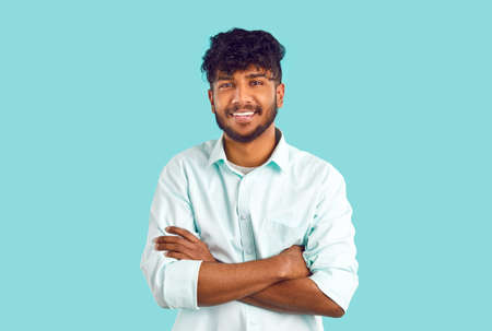 Portrait of happy ethnic student. Cheerful young dark skinned Indian, Arab, Gypsy or Bangladeshi man with curly black hair in white shirt standing with his arms folded, looking at camera and smiling