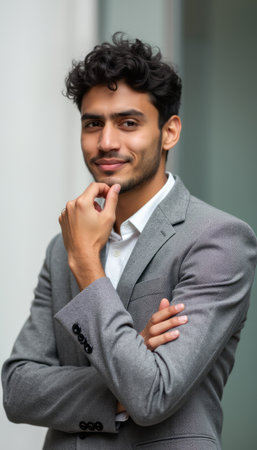 A charismatic young man with curly hair poses confidently in a tailored gray suit, exuding charm and professionalism. His thoughtful expression and relaxed posture suggest a blend of ambition and approachability, making him a perfect representation of modern success.