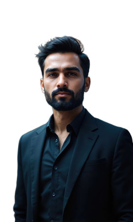 A South Asian male entrepreneur in a tailored black blazer, surrounded by digital financial projections and business data, symbolizing his