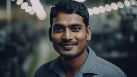 A smiling Indian male electronic factory worker standing in factory. Generative AI AIG19.