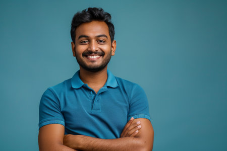 an Indian man in a blue polo shirt, smiling on a blue studio background