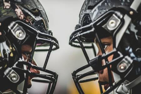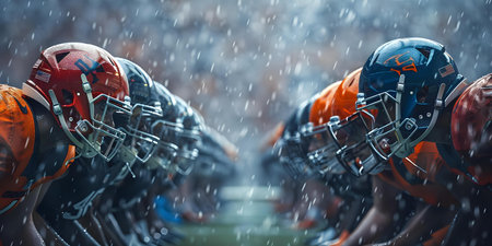 Two teams prepare for start of American football play, face to face in helmets, ready to clash in intense sports moment.