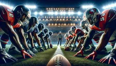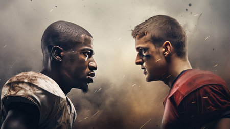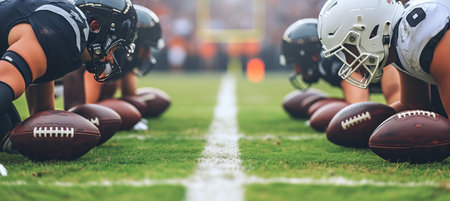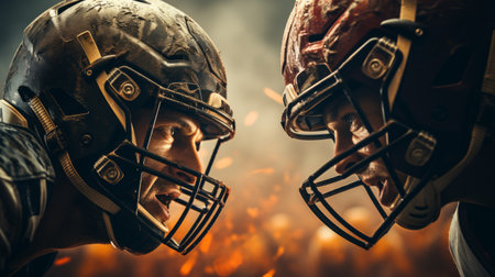 Intense faceoff between American football championship teams in a dramatic stadium setting with aggressive players ready for action. Concept Sports Photography, American Football, Championship Teams