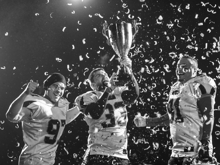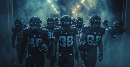 Group of american football players in full gear, ready for kickoff and eager to begin their match