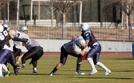 KHARKIV, UKRAINE - SEPTEMBER 26, 2020: American football players in action during match of Ukrainian Super League Atlantes Kharkiv vs. Slavs Kyiv