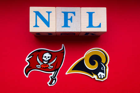 January 20, 2022. Tampa, Florida. The emblems of the football clubs participating in the playoffs of the National Football League Tampa Bay Buccaneers and Los Angeles Rams on a red background.