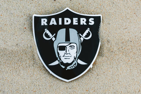 September 15, 2021, Moscow, Russia. The of the Las Vegas Raiders football club on the sand of the beach.