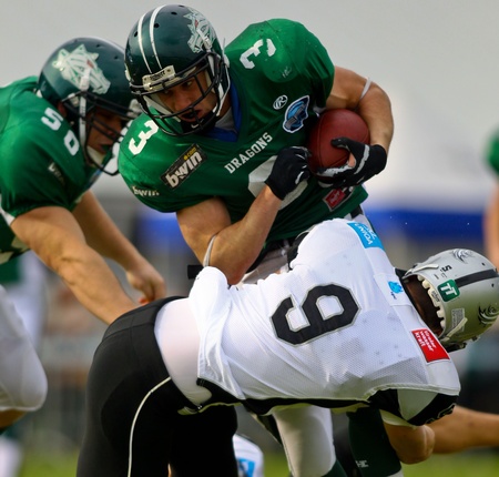 KORNEUBURG, AUSTRIA - MAY 8 Danube Dragons beat Tirol Raiders in an AFL-season game 33-28 on May 8, 2010. Shown are RB Andrej Kliman (Dragons #3) and DB Immo Soellner (Raiders #9).