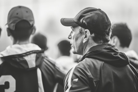 Black and white photo of a football coach giving instructions to the team on the sidelines during a game, A coach giving instructions to the team on the sidelines