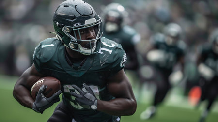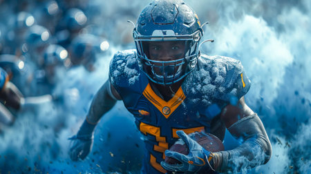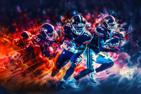 Close-up of focused American football player in helmet holding ball during night game. Intense athlete in action on stadium field with teammates blurred in background. Sports and competition concept.