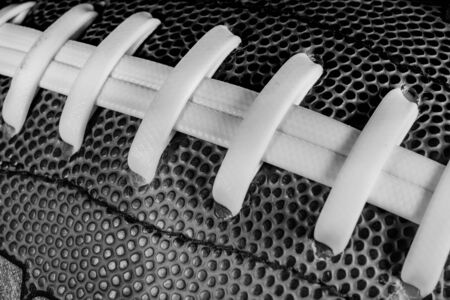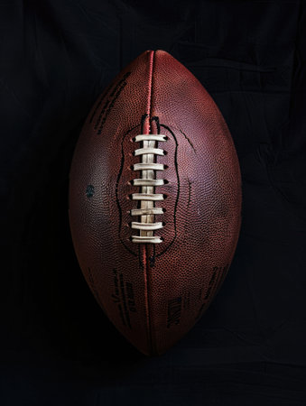 A detailed image of an American football positioned upright against a black background, showing the texture of the ball