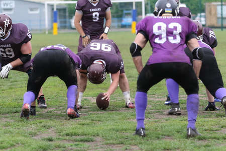 ODESSA, UKRAINE - May 30, 2021: American football on the grass. A tough duel, a battle between Odessa REINGERS and Nikolaev VIKINGS on the wet lawn of stadium. Tough American Football Athletes Battle