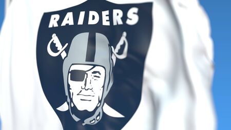 Flying flag with Oakland Raiders team logo, close-up. Editorial 3D rendering