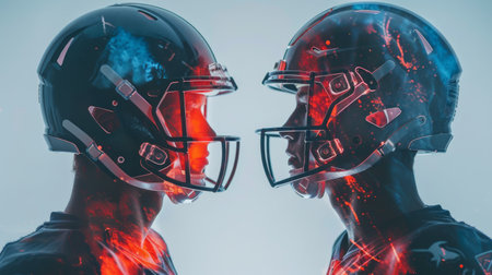 Two man, American football players in uniform and helmets looks to each other, eye-to-eye while playing game on fired stadium.