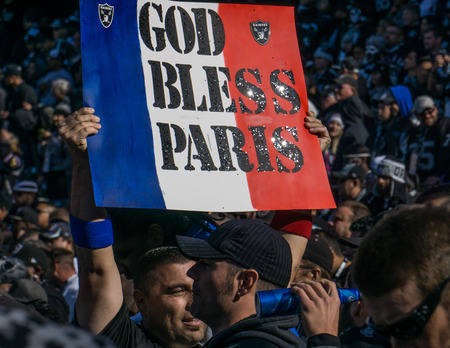 Raiders fans holding a sign in support of Paris, at a football game in Raider Stadium, Oakland, California.