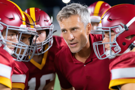 American football coach briefing players in a locker room, outlining strategy and tactics while team listens intently, focused and preparing for the upcoming game