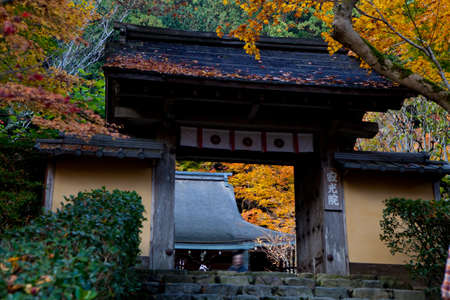 Japanese people enter at Kenninji temple gate with beautiful fall foliage leaves, Kyoto, Japan. Famous travel destination in Kansai especially in autumn season.