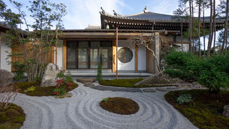 Traditional wooden structure of Hokoku-ji shrine bamboo temple nestled among pine, maple, and forest trees in Kamakura, Japan’s peaceful natural setting