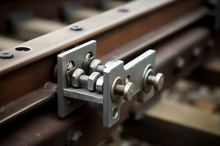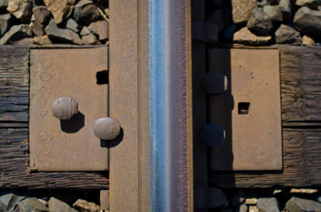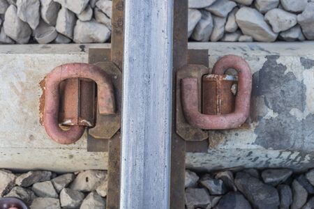 Low angle view of the screws fixing railroad rail close up
