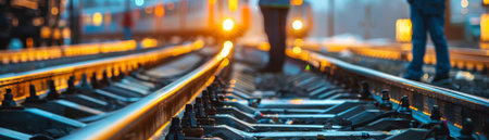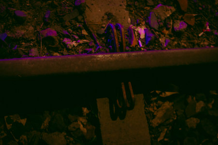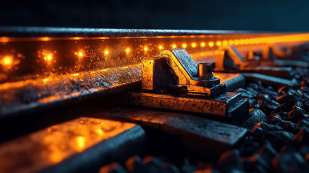 Close-up of glowing railway track at night, showcasing vibrant light and rustic metal, creating a dramatic and intriguing atmosphere.