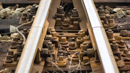 Low perspective on an old railway track. rusted nuts and bolts on old railway sleepers on railroad to unused. No Train passed for a long time.
