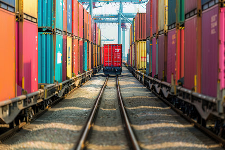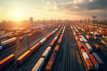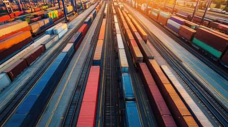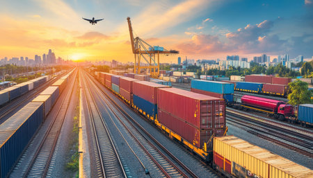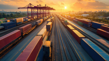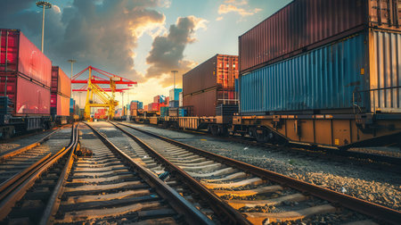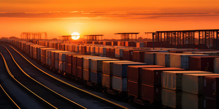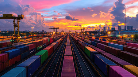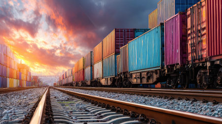 A bustling freight route under a vivid, sunset sky, featuring vibrant containers stacked along sturdy rails, capturing industrial energy and sunset hues.