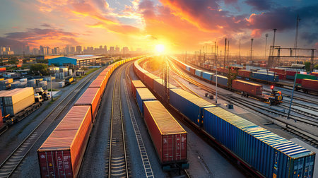 Freight trains loaded with containers aligned on tracks at a railway yard as the sun sets, creating a warm glow over the landscape. The scene highlights the connection of global trade networks.