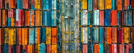 Shipping containers are neatly arranged in vibrant colors at a busy port. A wide pathway runs through the containers showcasing an organized layout. The scene captures the essence of logistics.