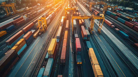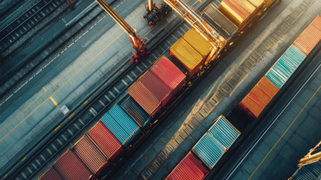 Captivating aerial view of a container port at sunset, showcasing vibrant cargo containers and cranes, reflecting the dynamic nature of global trade and transportation.