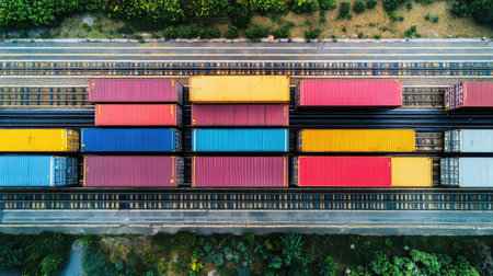 A vibrant aerial view showcases an organized array of colorful cargo containers placed on railway tracks, set against a backdrop of lush greenery and industrial scenery.