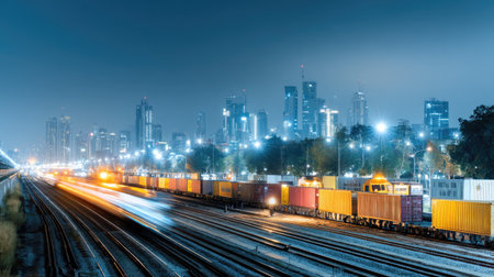 A stunning nighttime view showcasing train tracks lined with colorful cargo containers against a vibrant city skyline illuminated by urban lights.