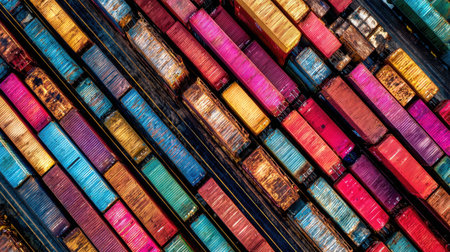 An aerial view showcasing organized rows of vibrant, multi-colored shipping containers in an industrial container terminal. This image highlights global trade infrastructure and logistical precision, capturing an abstract yet structured aesthetic.
