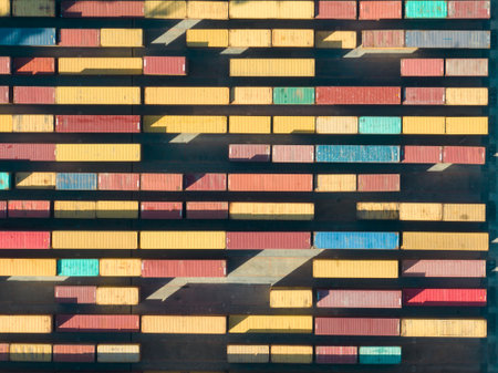 Overhead view captures the vibrant array of shipping containers at a bustling port, illustrating the complexity of global trade and cargo logistics in a colorful display.