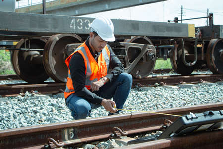 Inspector Engineering wearing helmet and vest worker unifrom checking railway construction work on rail track. Asian workers use tape measure to measure railroad tracks.