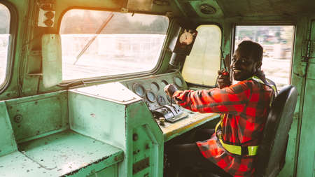 African train driver talking radio communication or walkie talkie in interior room to control place of train