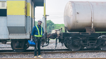 African machine engineer technician wearing a helmet, groves and safety vest is using a wrench to repair the train