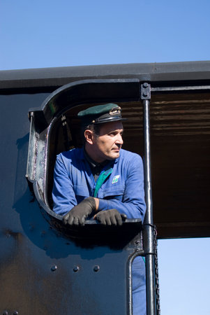 Steam engine driver looking out of his cab in Imperia city station in Italy